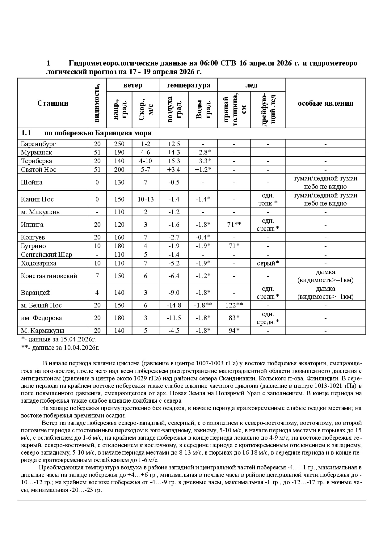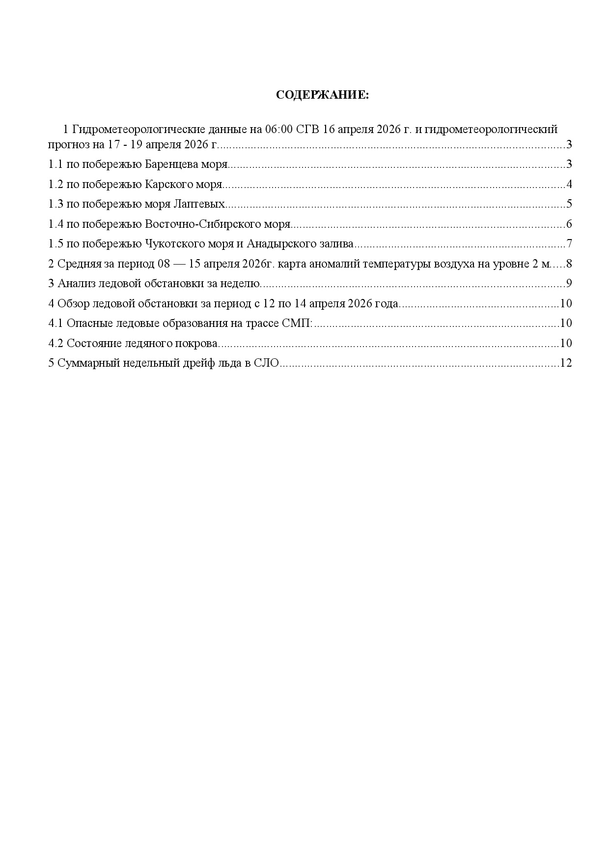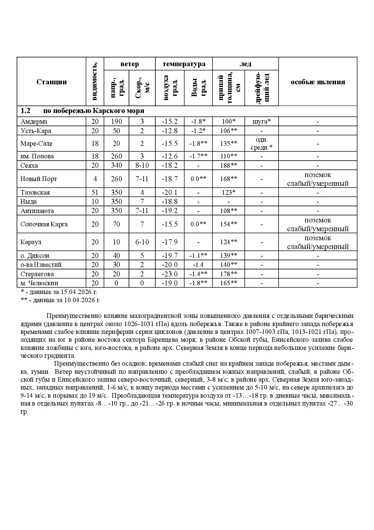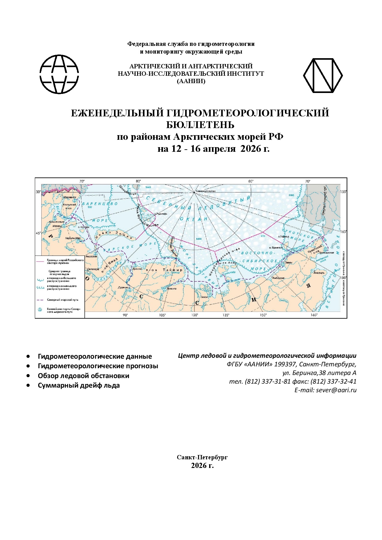 ЕЖЕНЕДЕЛЬНЫЙ ГИДРОМЕТЕОРОЛОГИЧЕСКИЙ БЮЛЛЕТЕНЬ по районам Арктических морей РФ на 12 - 16 апреля 2026 г.