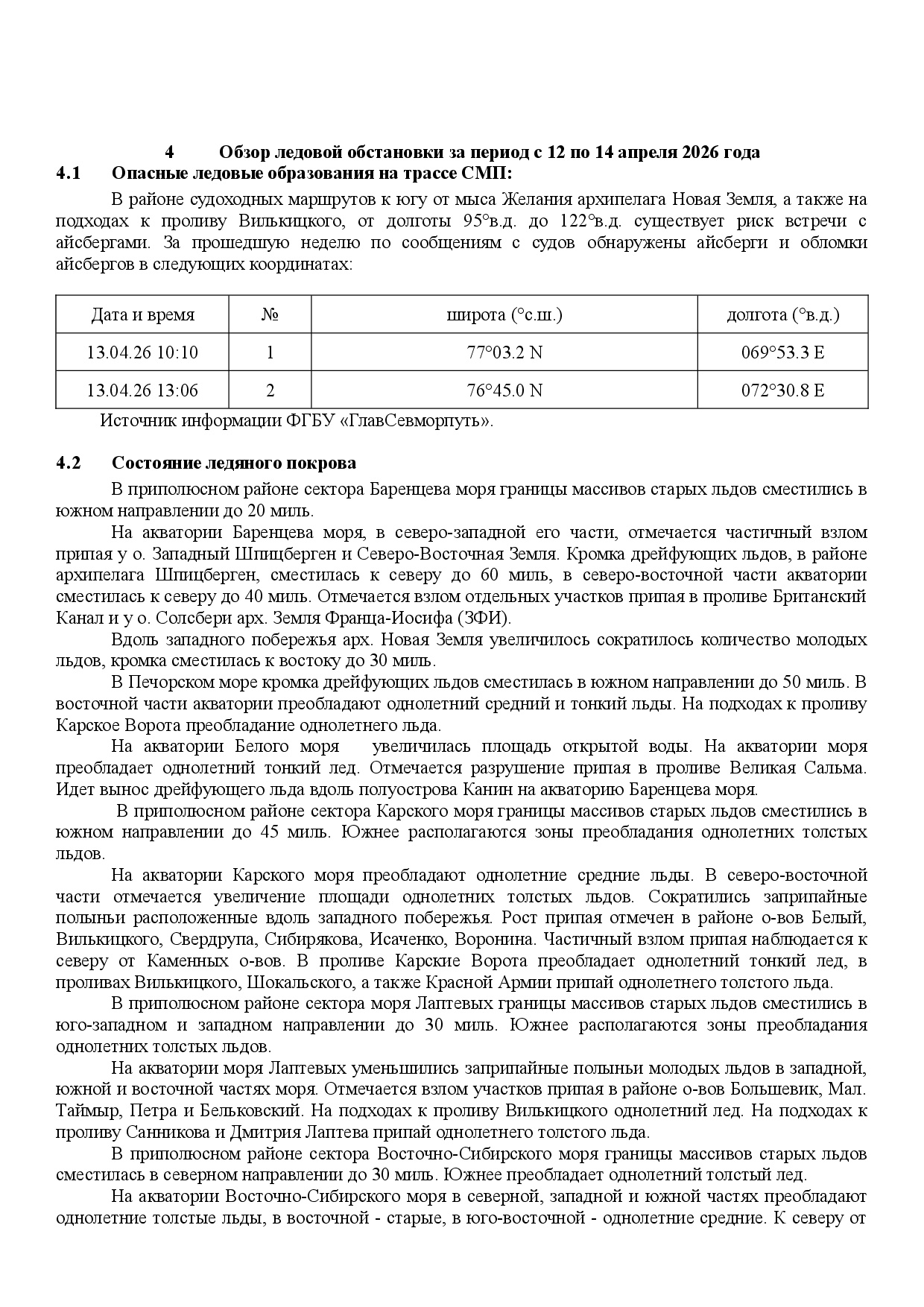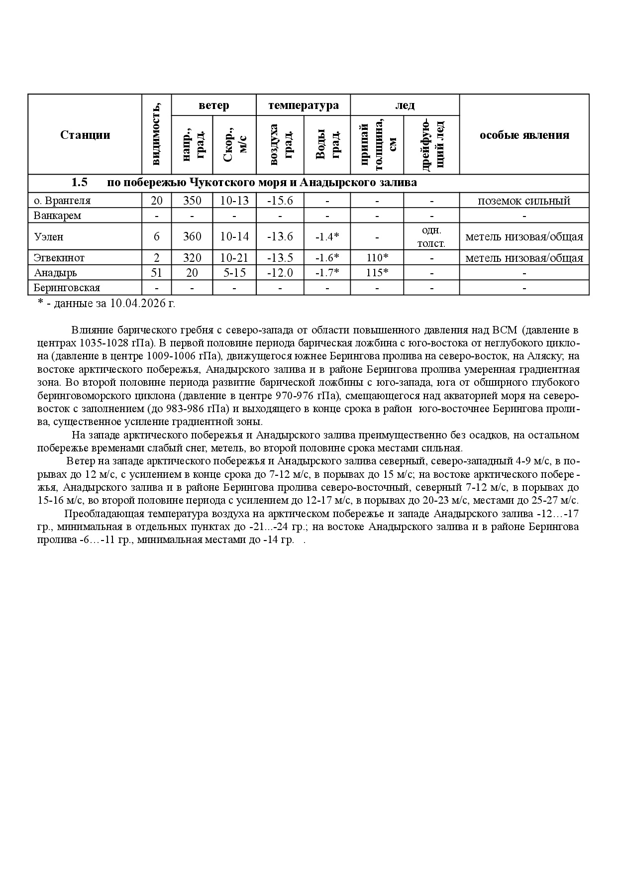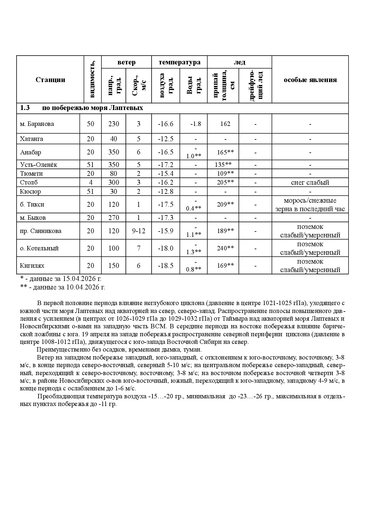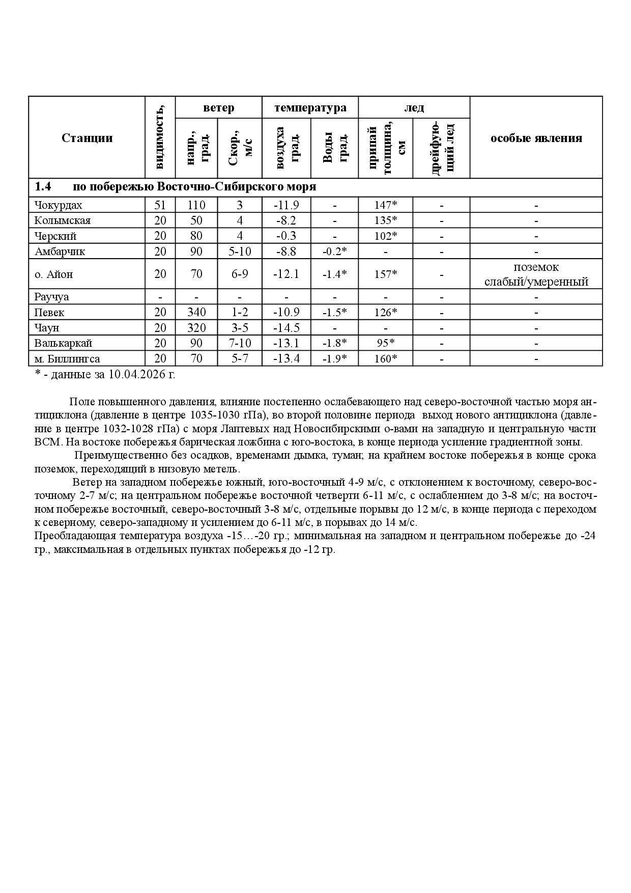 ЕЖЕНЕДЕЛЬНЫЙ ГИДРОМЕТЕОРОЛОГИЧЕСКИЙ БЮЛЛЕТЕНЬ по районам Арктических морей РФ на 12 - 16 апреля 2026 г.